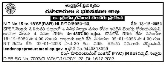 Tender for 4 different construction works in SPSR Nellore & Tirupati Districts.
