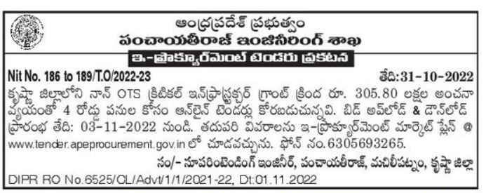 Tender for 4 road works at an estimated cost of Rs.305.80 lakh under Non OTS Critical Infrastructure Grant in Krishna District.