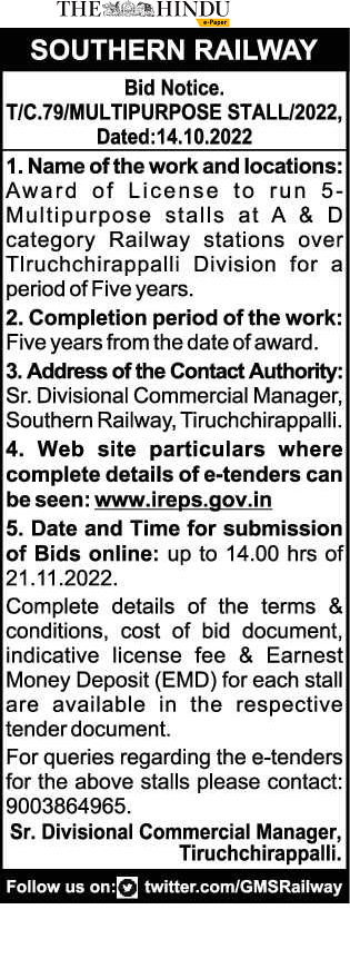 Award of License to run 5 Multipurpose stalls at A & D category Railway stations over Tiruchchirappalli Division for a period of Five years.