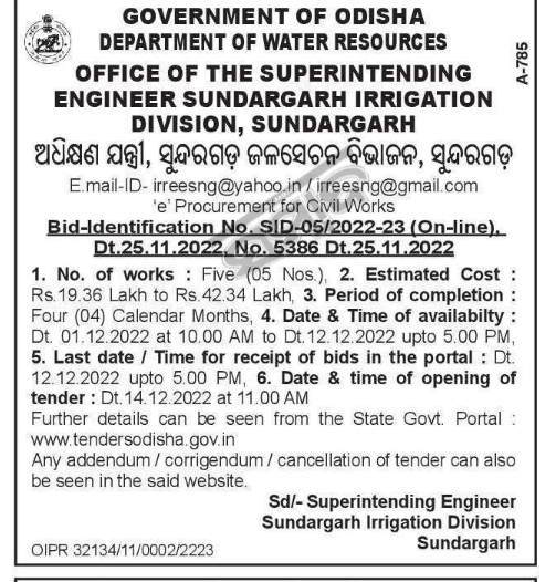 TENDER FOR 5 NO.OF WORKS IN GOVERNMENT OF ODISHA DEPARTMENT OF WATER RESOURCES OFFICE OF THE SUPERINTENDING ENGINEER SUNDARGARH IRRIGATION DIVISION, SUNDARGARH
