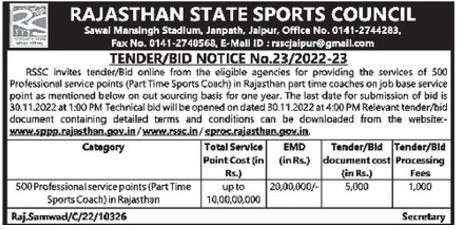 Tender for 500 Professional service points (Part Time Sports Coach) in Rajasthan