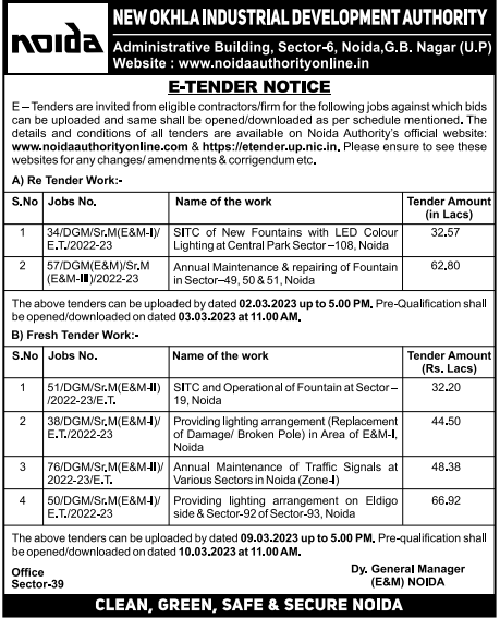 Tender for 57/DGM(E&M)/Sr.M (E&M-I)/2022-23 Annual Maintenance & repairing of Fountain in Sector-49, 50 & 51, Noida