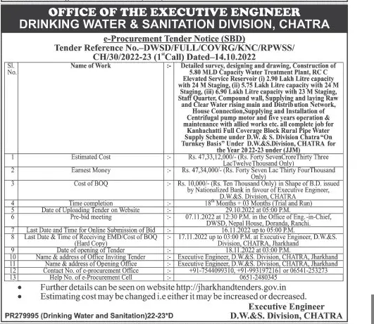 Tender for 6.90 Lakh Liter capacity with 23 M Staging, Staff Quarter, Compound wall, Supplying and laying Rawand Clear Water rising main and Distribution Network, House Connection, Supplying and Installation of Centrifugal pump motor and five years operation & maintenance with allied works etc.