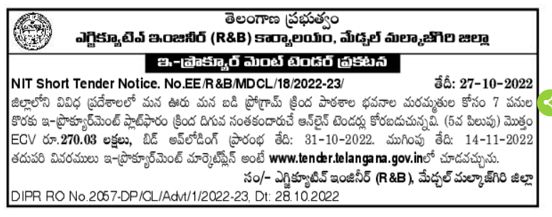 Tender for 7 works for renovation of school buildings under Mana Uru Mana Badi program at various places in the district.
