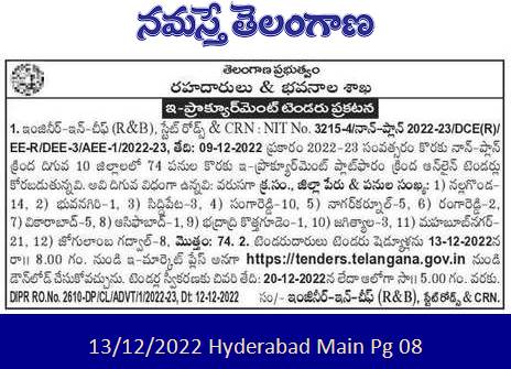 Tender FOR 74 WORKS IN BELOW 10 DISTRICTS UNDER NON-PLAN FOR THE YEAR 2022-23 | wanted. They are as under: respectively Cr. Year, Name of District & Number of Works: 1) Nalgonda- 14, 2) Bhuvanagiri-1, 3) Siddipet-3, 4) Sangareddy-10, 5) Nagar Kurnool-5, 6) Rangareddy-2, 7) Vikarabad- 5, 8) Asifabad-1, 9) Bhadradri Kothagudem-1, 10) Jagityala-3, 11) Mahbubnagar- 21, 12) Jogulamba Gadwal-8,