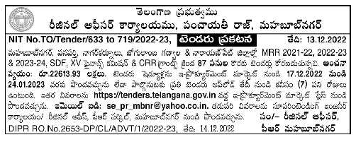 Mahbub Nagar, Vanaparthi, Nagar Kurnool, Jogulamba Gadwala & Narayan Pate Districts & 2023-24, tenders are invited for 87 works under SDF, XV Finance Commission & CRR grants.
