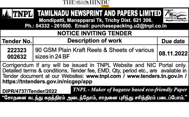 Tender for 90 GSM Plain Kraft Reels & Sheets of various sizes in 24 BF