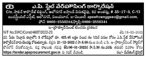 Tender for A.P. for civil works worth Rs.425.45 lakhs at 3 locations in Nellore district. State Warehousing Corporation