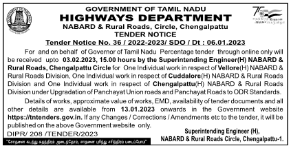 Superintending Engineer(H) NABARD & Rural Roads,Chengalpattu Circle for One Individual work in respect of Vellore (H) NABARD & Rural Roads Division,