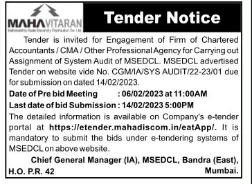 Tender for Accountants/CMA/Other Professional Agency for Carrying out Assignment of System Audit of MSEDCL. MSEDCL advertised Tender on website vide No. CGM/IA/SYS AUDIT/22-23/01