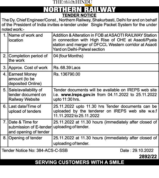 Tender for Addition & Alteration in FOB at ASAOTI RAILWAY Station