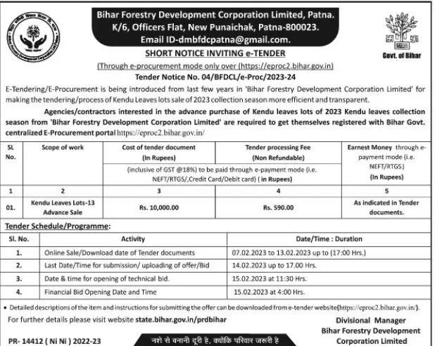 Tender for Agencies/contractors interested in the advance purchase of Kendu leaves lots of 2023 Kendu leaves collection season from ‘Bihar Forestry Development Corporation Limited