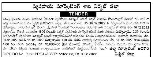 Tender for Agricultural Market Committee has decided to allot the vacant shops in Nirmal and Sarangapur on the proposed reservation rent.