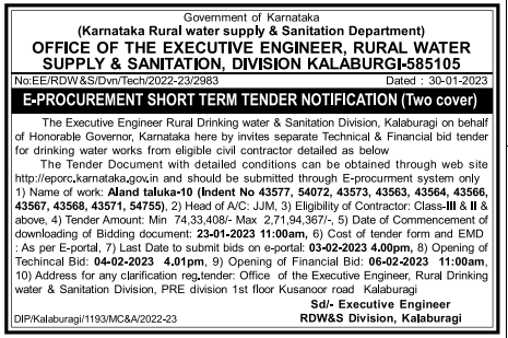 Tender for Aland taluka-10 (Indent No 43577, 54072, 43573, 43563, 43564, 43566, 43567, 43568, 43571, 54755), 2) Head of A/C: JJM,