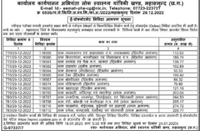 Tender for All works of single village tap water supply schemes under Jal Jeevan Mission in different villages of Mahasamund Bagbahra Basna Saraipali, development block of Mahasamund district