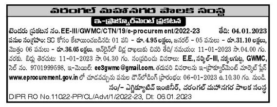 Tender for Allocated for SC: 01 Work – Rs. 4.95 Lakhs, General – 05 Works in Warangal Metropolitan Municipality