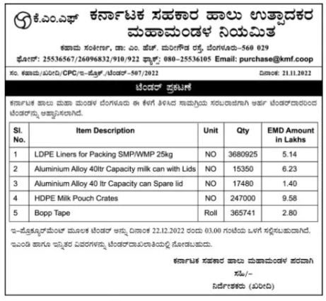 Karnataka Milk Maha Mandal Bangalore Tenders are invited from the applicant tenderers for the supply