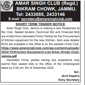 Tender for Amar Singh Club, Jammu is making a new Restaurant at the Club. Sealed