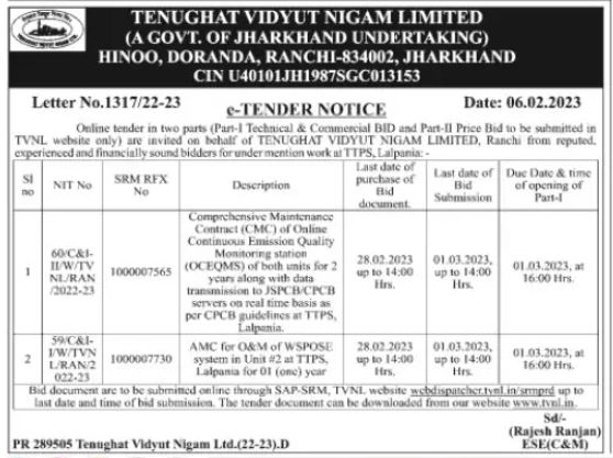 Online tender in two parts (Part-1 Technical & Commercial BID and Part-II Price Bid to be submitted in TVNL website only) are invited on behalf of TENUGHAT VIDYUT NIGAM LIMITED, Ranchi from reputed. experienced and financially sound bidders for under mention work ut TTPS, Lalpani
