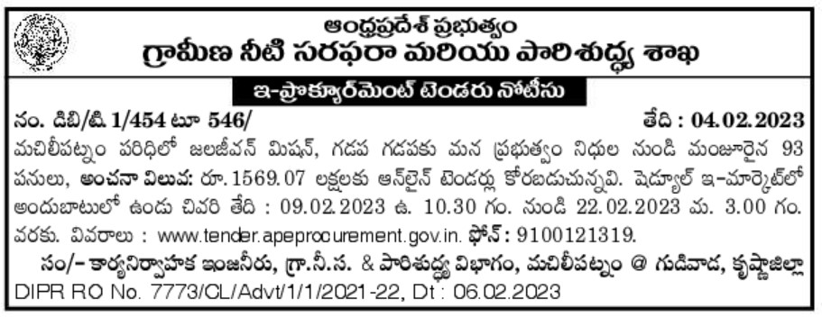 Jaljeevan Mission, Gadapa Gadapa under Machilipatnam, estimated value: Rs.1569.07 lakhs. Last date to