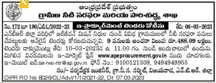 Online tenders are invited for taking up water supply works in various villages from Jaljeevan Mission funds in NTR district. Estimated value of 9 works: Rs.488.09 lakhs.