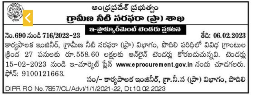Tender for Andhra Pradesh Govt Rural Water Supply (RWA) Department E-Procurement Tender Announcement