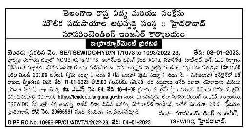 Tender for Anganwadi Building in erstwhile Rangareddy District ACRS, Protection Wall, Toilet Block, GJC Construction, [[13.Nos.] Eligible for Strengthening Infrastructure of Schools
