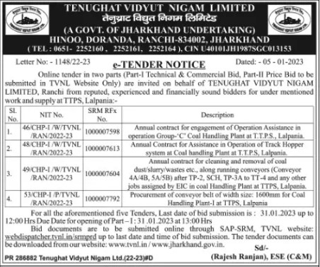 Tender for Annual contract for cleaning and removal of coal dust/slurry/wastes etc., along running conveyors (Conveyor 4A/4B, 5A/5B) after TP-2, SCH, TP-3A to TT-4 and any other jobs assigned by EIC in coal Handling Plant at TTPS, Lalpania.