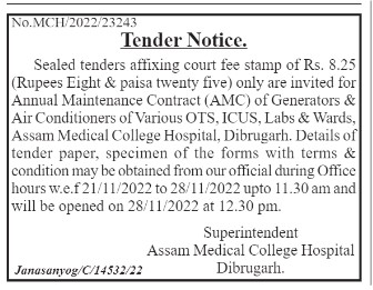 Annual Maintenance Contract (AMC) of Generators & Air Conditioners of Various OTS, ICUS, Labs & Wards, Assam Medical College Hospital,