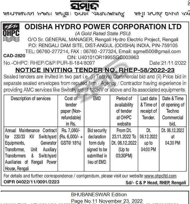 P.O: RENGALI DAM SITE, DIST-ANGUL (ODISHA) INDIA, PIN-759105