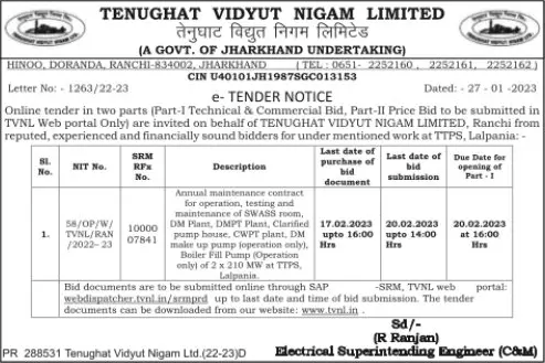 Tender for Annual maintenance contract for operation, testing and maintenance of SWASS room, DM Plant, DMPT Plant, Clarified pump house, CWPT plant, DM make up pump foperation only). Hrs Boiler Fill Pump (Operation only) of 2 x 210 MW at TTPS, Lalpania