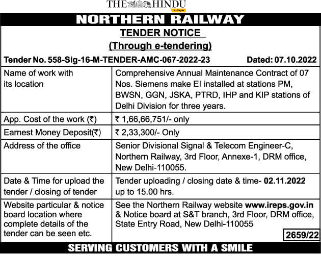 Comprehensive Annual Maintenance Contract of 07 Nos. Siemens make El installed at stations PM, BWSN, GGN, JSKA, PTRD, IHP and KIP stations of Delhi Division for three years.