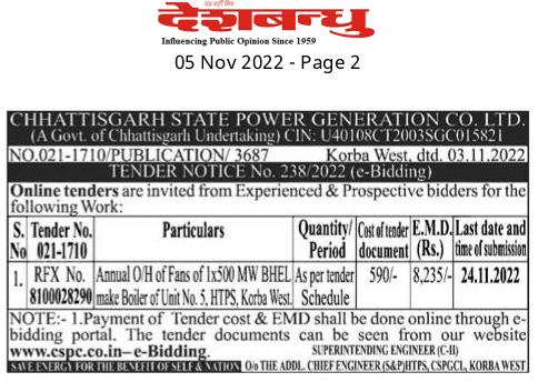 Tender for Annual O/H of Fans of 1×500 MW BHEL make Boiler