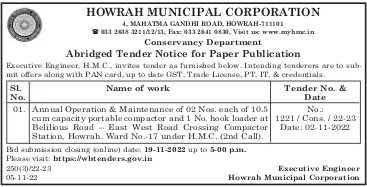 Tender for Annual Operation & Maintenance of 02 Nos, each of 10.5 cum capacity portable compactor and 1 No. hook loader at Belilious Road – East West Road Crossing Compactor Station, Howrah. Ward No.-17 under H.M.C. (2nd Call).