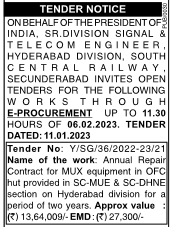 Tender for Annual Repair Contract for MUX equipment in OFC hut provided in SC-MUE & SC-DHNE section on Hyderabad division for a period of two years.