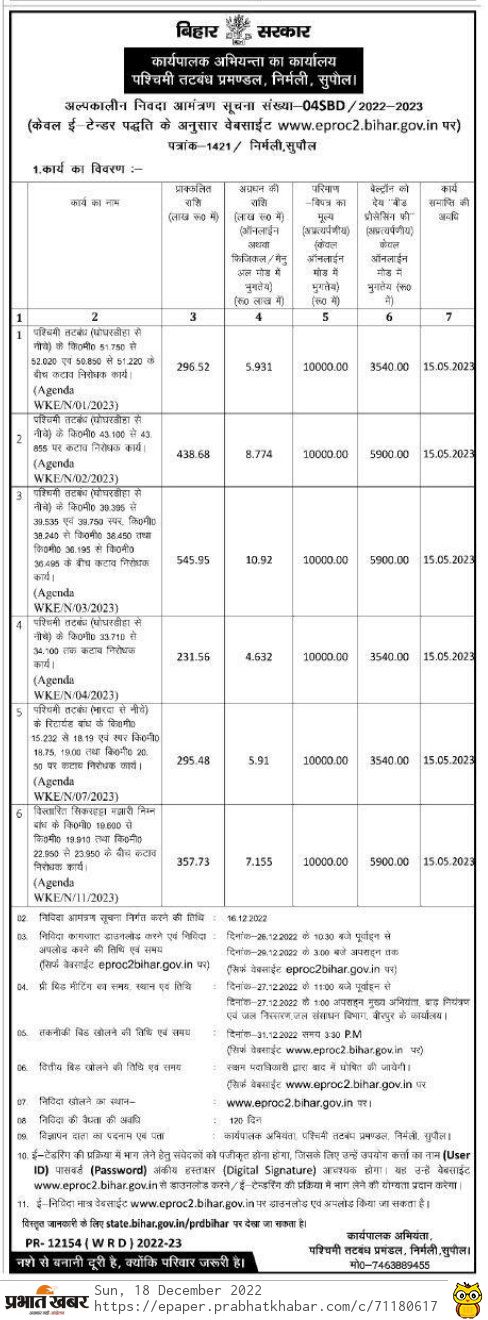 Tender for Anti-erosion work at km 43.100 to 43.855 of western embankment (below Ghoghardiha). (Agenda WKE/N/02/2023)