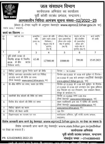 Tender for Anti-erosion work between Km 87.80 to Km 88.06 of East Koshi embankment