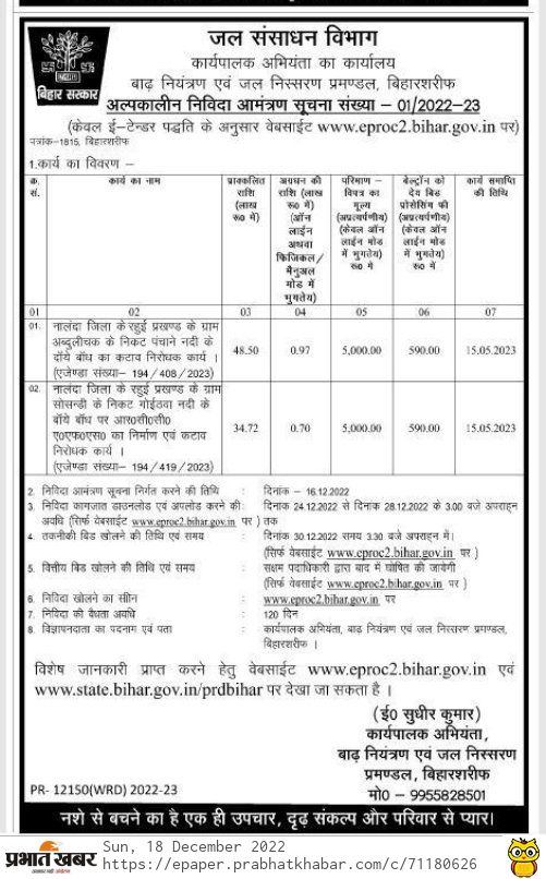 Tender for Anti-erosion work of right dam of Panchane river near village Abdulichak of Rahui block of Nalanda district. (Agenda Number- 194 / 408 / 2023)
