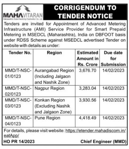 Tender for Appointment of Advanced Metering Infrastructure (AMI) Service Provider for Smart Prepaid Metering in MSEDCL (Maharashtra), India on DBFOOT basis under RDSS Scheme against MSEDCL advertised Tender Konkan Region (Excluding Nashik and Jalgaon Zone)