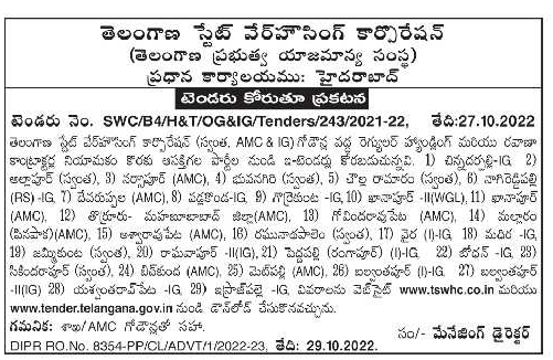 Tender for appointment of regular handling and transport contractors at godowns. 1) Chinnadarpalli-1G 2) Allapur (Own), 3) Narsapur (AMC), 4) Bhuvanagiri (Own), 5) Boulla Ramaram