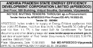 Tender for APSEEDCO invites tenders for supply of Energy Errident appliances 1500 Nos. 20W LED Batten, 1500 Nes. Max 35 W, 5 Star Rated BLOC Ceiling Fans and 100 Nos 1.5 TR, 5 Star rated Split Air Conditioners
