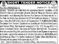 Tender for are invited from wel experienced firms for installation of 60 Stals with actonium and laminated plywood. Electrical fitings and Electrical Lights and material,Auto Slickering, Flex Banners, Pole Banners and Pamphlets etc, for the State Hardloom Expo sponsored by DC for Handlooms Ministry of Text es Goof India, New Delhi to be conduces al Mayawada