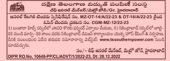 1) Arranging furniture for JACO in Banjara Hills Circle, 2) Housekeeping & Maintenance of Secunderabad Division Office from July- 22nd to March- 23rd in Secunderabad Circle.