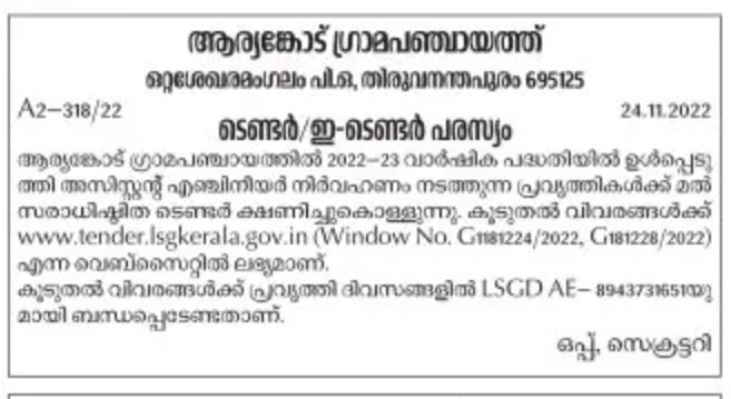 Aryankot Gram Panchayat invites tender based on Mal