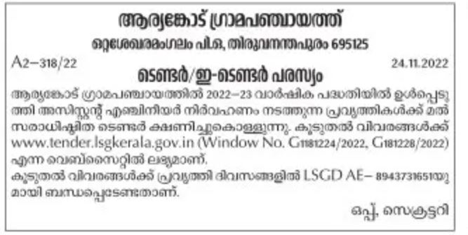 Aryankot Gram Panchayat invites tender based on Mal