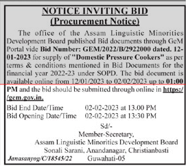 Tender for Assam Linguistic Minorities Development Board published Bid documents through GeM Portal vide Bid Number: GEM/2022/B/2922000 supply of “Domestic Pressure Cookers