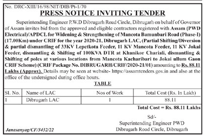 Assam (PWD Electrical)/APDCL for Widening & Strengthening of Mancota Bamunbari Road (Phase-I) (17.00Km) under CRIF for the year 2020-21, Dibrugarh LAC, (Partial Shifting/Diversion & partial dismantling of 33KV Lepetkota Feeder, 11 KV Mancota Feeder, 11 KV Jokai Feeder, dismantling & Shifting of 100KVA DTR at Khanikor Chariali, dismantling & Shifting of poles at various locations from Mancota Kacharibari to Jokai ullum Gaon CRIF Scheme) (CRIF Package No. DIBRUGARH/CRIF/2020-21/01)