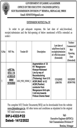 Tender for Augmentation of 33 KV Wanganpora Khanyar-Rainwari Line by way of Reconductoring (Thickening) from 0.15 ACSR (Wolf) to 0.2 ACSR (Panther conductor from Wanganpora Grid upto 3 ckt kms towards Firdous Cinema Hawal