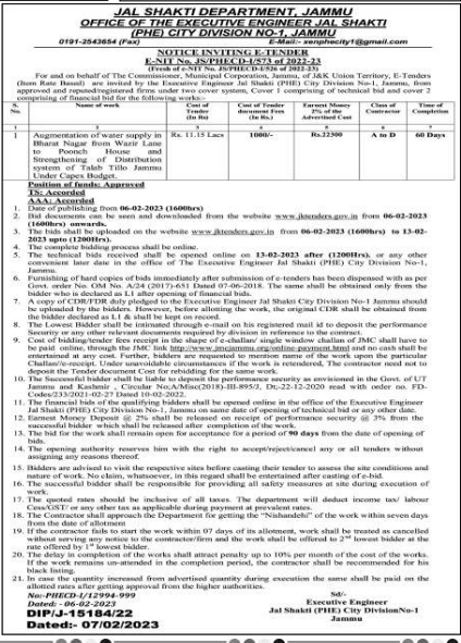 Tender for Augmentation of water supply in Strengthening of Distribution Bharat Nagar from Wazir Lane system of Talab Tillo Jammu Under Capex Budget. Position of funds: