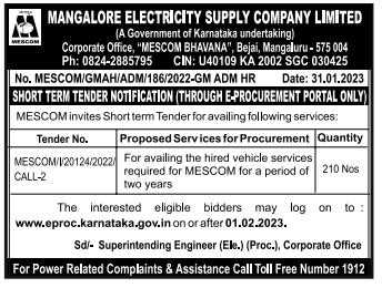 Tender For availing the hired vehicle services required for MESCOM for a period of two years